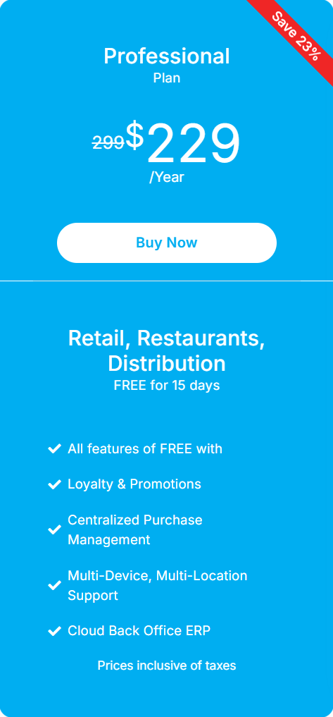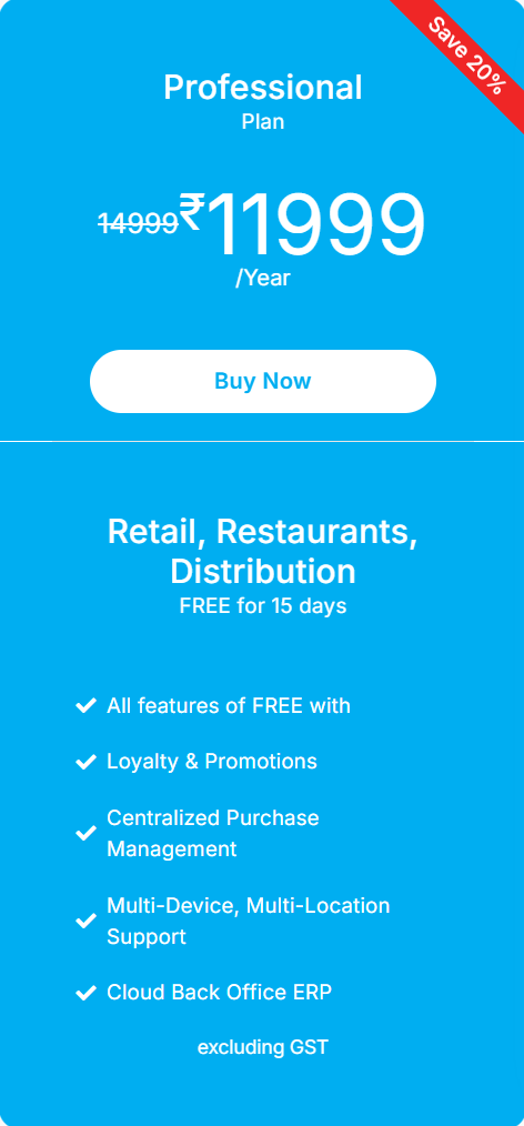 If you are a single outlet business, our Just Billing Free POS App is just right for you. This is available free of charge for a whole year and brings most key modules on your fingertips. If you are a multi-location business, you can opt for the Professional plan, available to try for 15 days free, with access to all modules to manage your business in its entirety.