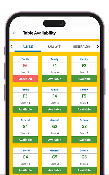 You can see a clear, colorful grid showing table availability (e.g., F1, G2) with seat counts and real-time statuses (“Available” in green, “Occupied” in red). This lets staff quickly assign and track tables, perfect for managing dine‑in flow and reducing errors.