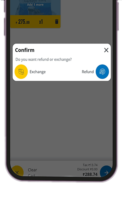 A pop-up dialog appears with simple, clear options to “Refund” or “Exchange.” The design is sleek and user-friendly—customers are guided through returns quickly, improving service efficiency and satisfaction.