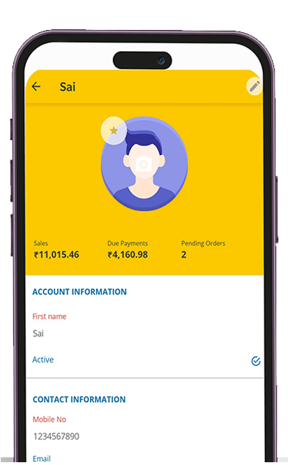 A customer profile screen displays key info—name, contact details, total sales, outstanding dues, and pending orders—all on a single page. This empowers staff to view and act on customer status instantly, enhancing personalized service.