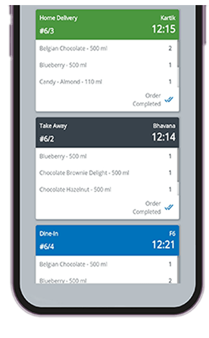 Orders are presented as cards, categorized by type (Home Delivery, Take Away, Dine‑In) with timestamps and status (“Order Completed”). The cloud-powered, organized queue helps kitchen staff prioritize and fulfill orders error-free.